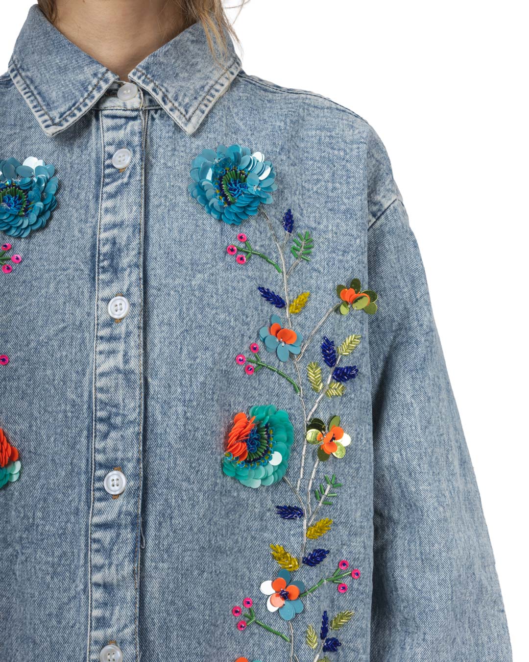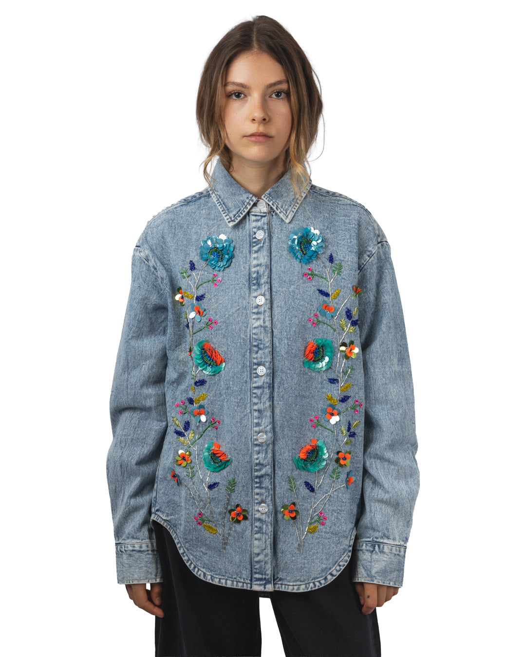 La Icksonville Sequin Denim Shirt réinvente la chemise en denim avec une approche festive et créative. Confectionnée en coton denim robuste, elle adopte une coupe oversize et des finitions classiques comme le col pointu et la fermeture boutonnée. Sa particularité réside dans ses broderies de sequins multicolores, appliquées en motifs audacieux qui transforment une pièce utilitaire en véritable déclaration de style.