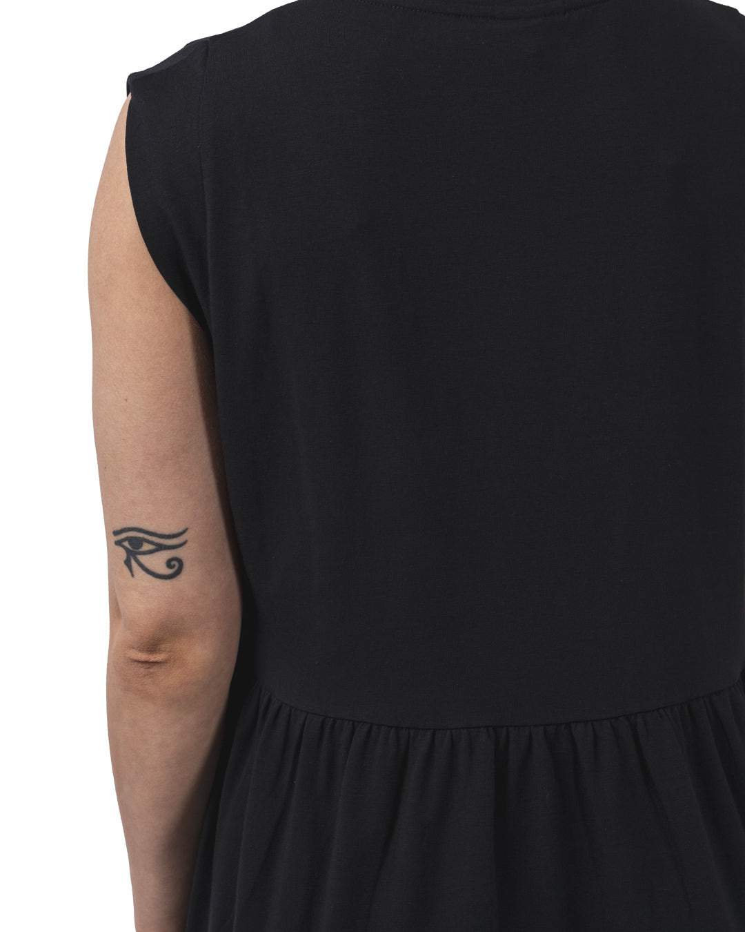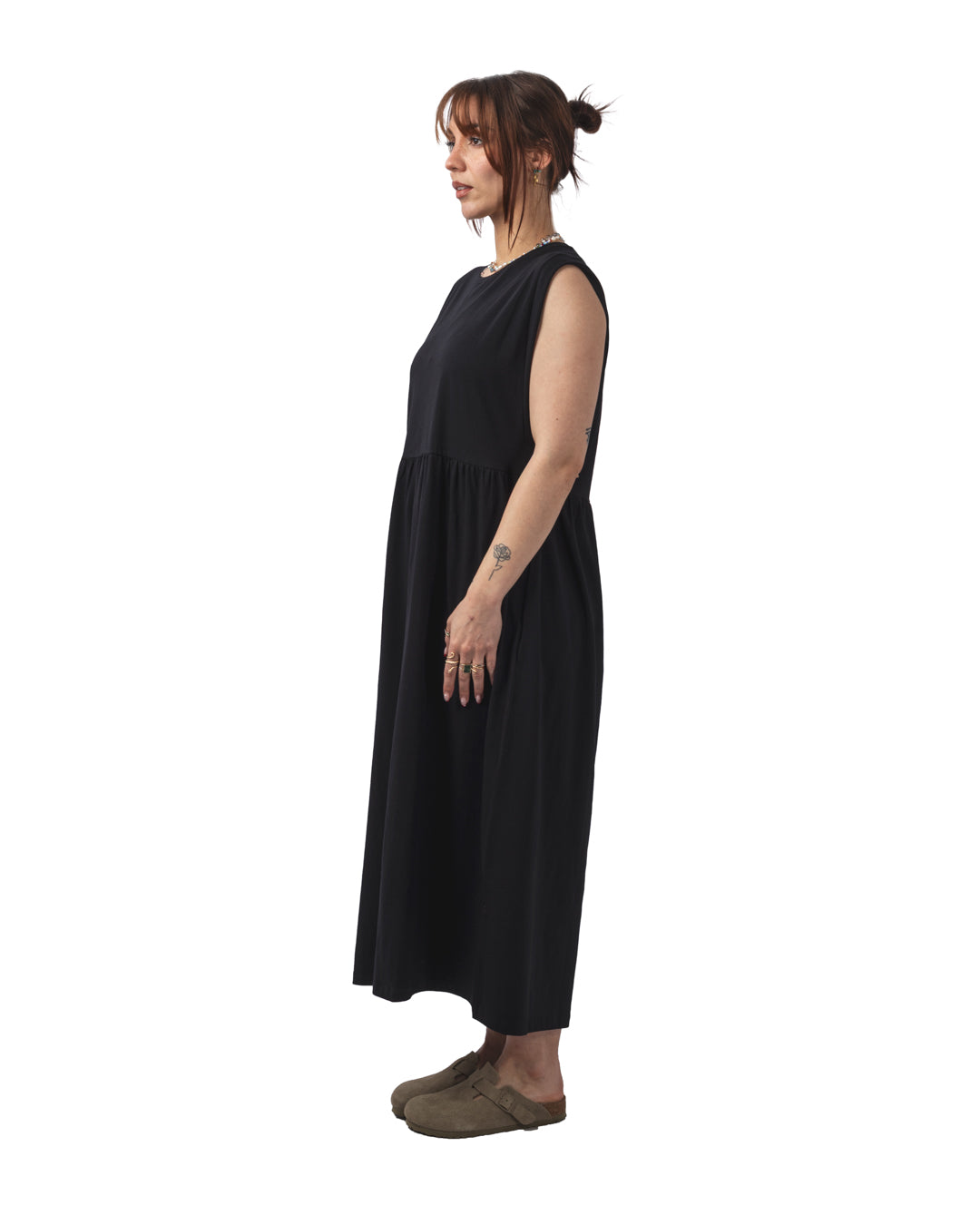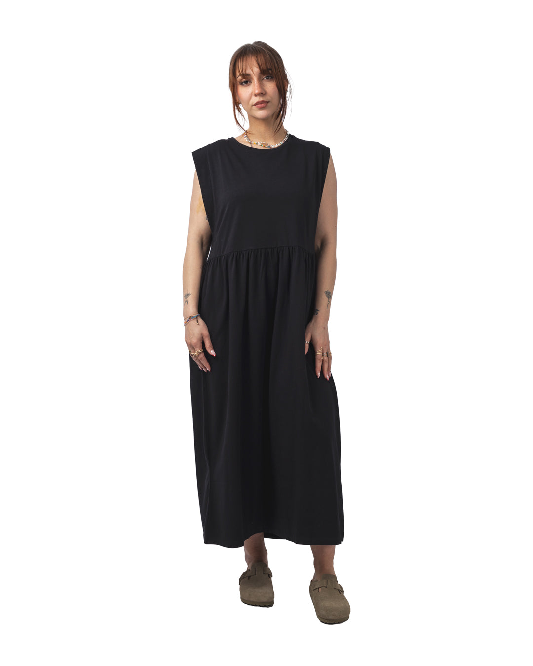The Tulula dress is a sleeveless mesh midi dress, offering a loose fit with a gathered empire waist. It features cuffed sleeves and dropped armholes, adding a relaxed yet elegant touch. Made from 93% cotton and 7% elastane, it ensures softness and flexibility. Ethically made in Portugal, this dress reflects Rita Row's values of sustainability.
