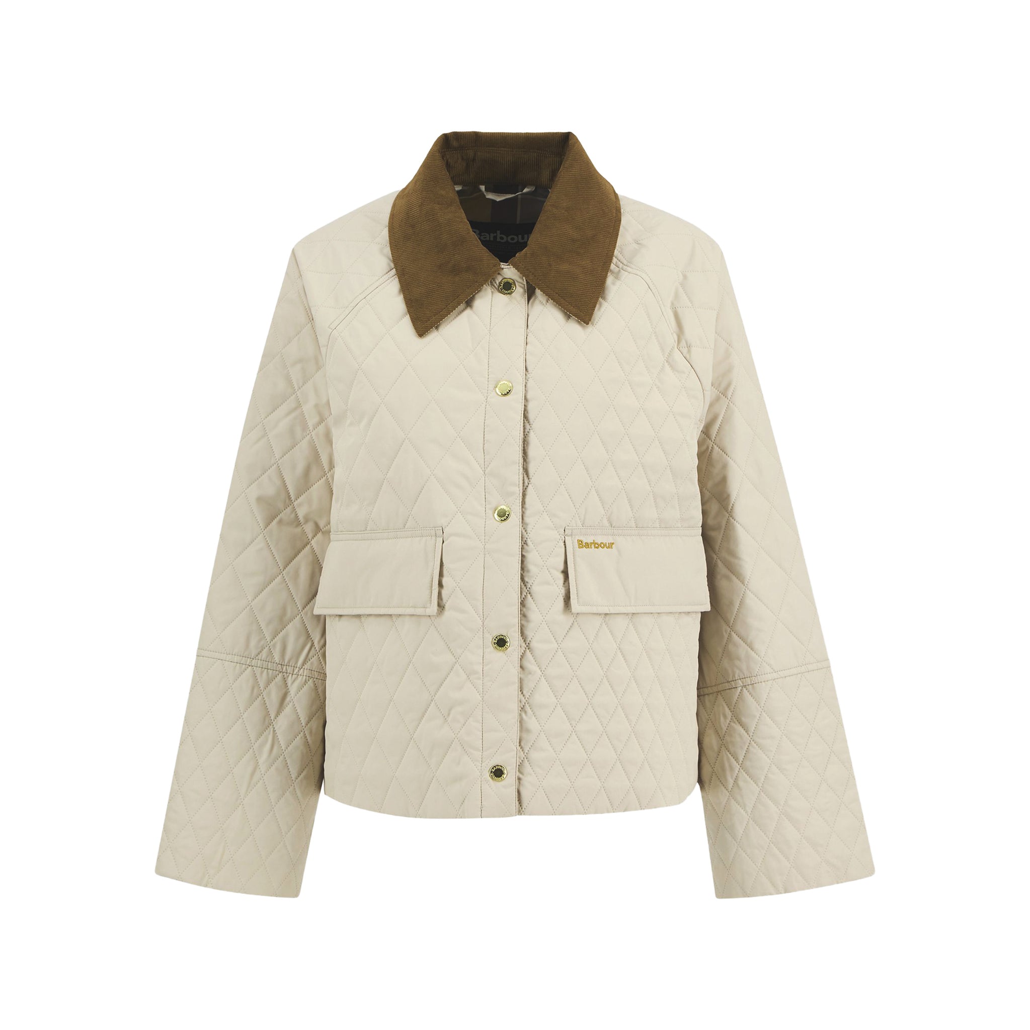 Confectionnée en polyester (extérieur/intérieur), elle adopte un matelassage sonic welded en motifs “box” (deux échelles de carreaux), pour un rendu graphique et propre. Côté détails : col en velours côtelé doux au toucher, poches à rabat bien dessinées, branding sur la poche gauche, et une doublure “buggy” tartan signature qui signe immédiatement l’ADN Barbour. Longueur dos annoncée : 60 cm.